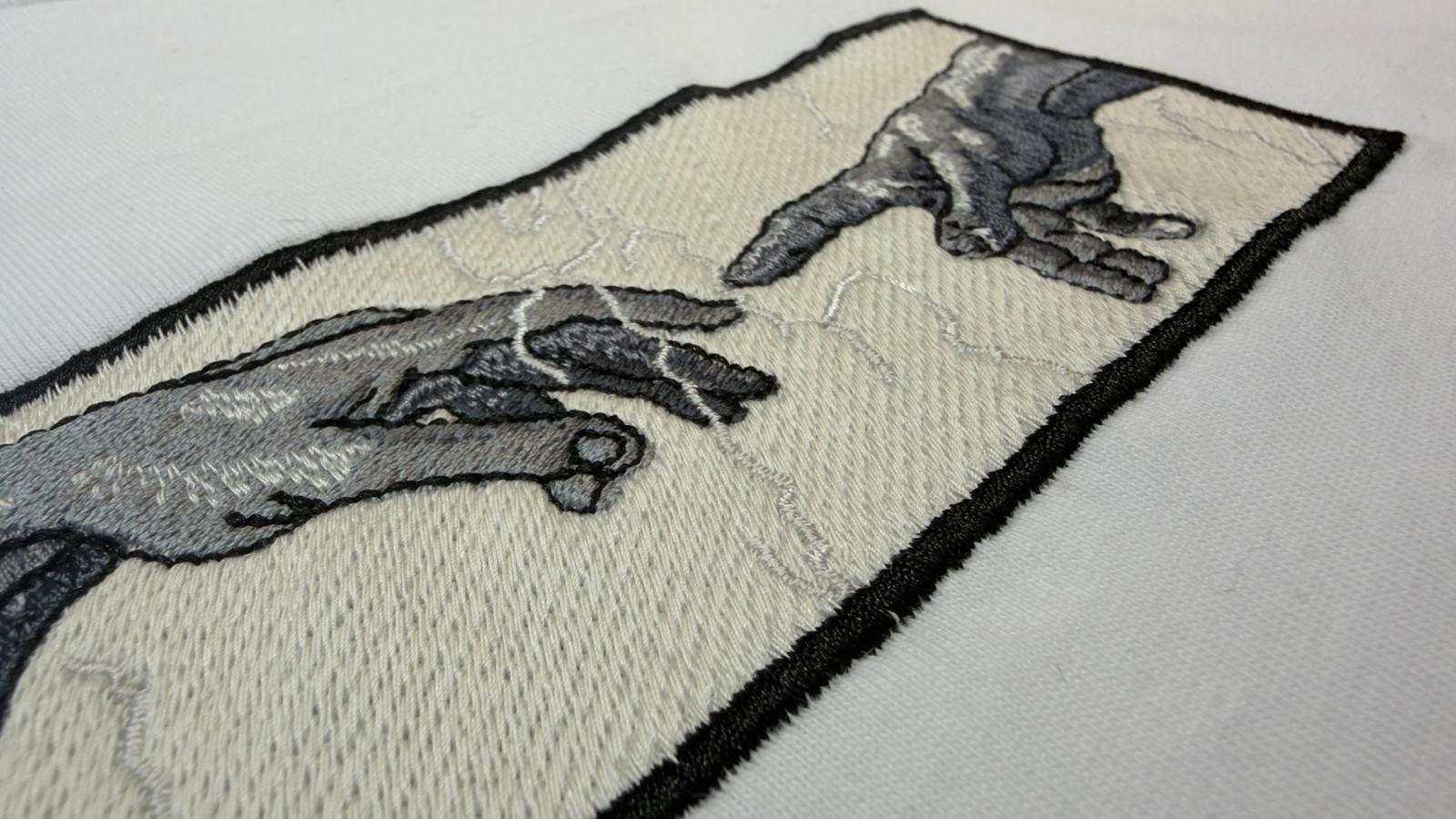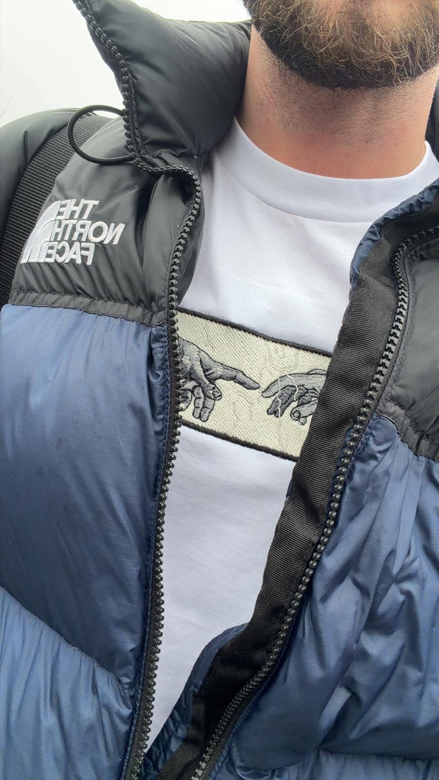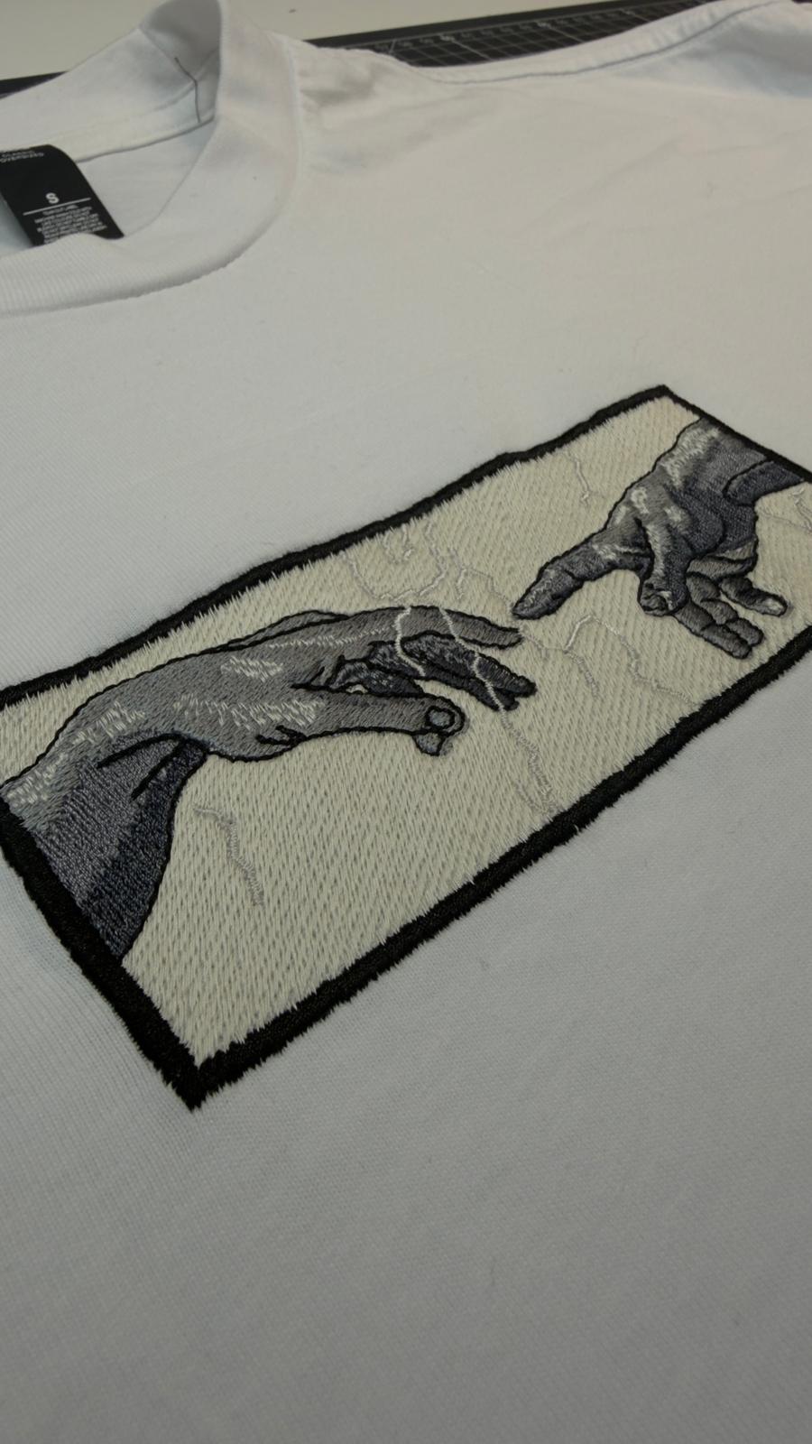Centred on the chest, two reaching hands are frozen just before touch. Inspired by The Creation of Adam, the embroidery symbolises connection, intention, and the space where creation begins. Subtle and meaningful, it represents becoming rather than completion — a quiet reminder that purpose often lives in the in-between.